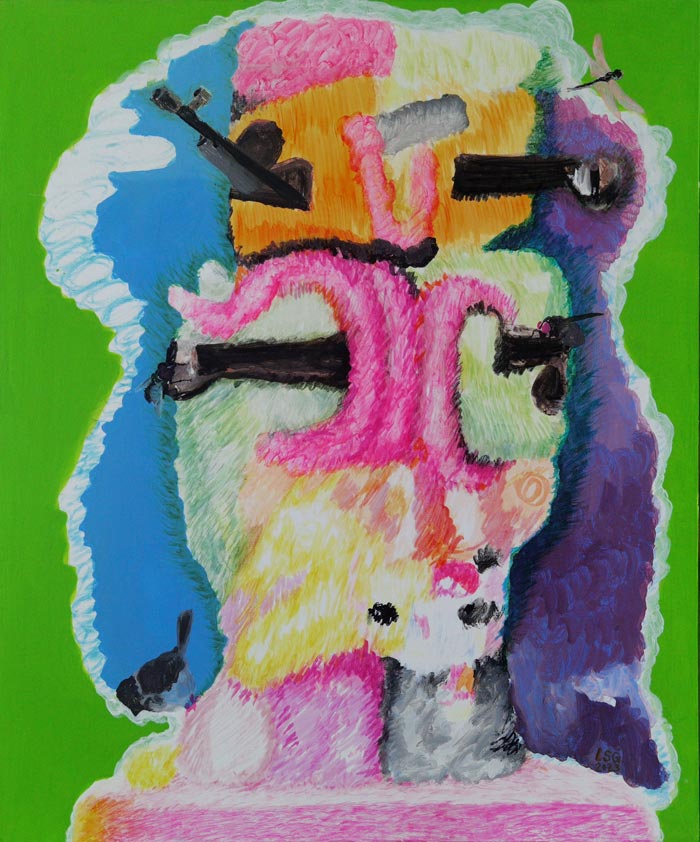面對(duì)現(xiàn)時(shí)生活觀念急劇轉(zhuǎn)型中的離奇和多樣,李世公以藝術(shù)旁觀者的本能的價(jià)值取向在語(yǔ)言上不斷的自我反思感悟,用荒謬、荒誕、荒疏離奇紛雜繚亂的形象組合表達(dá)個(gè)人的精神價(jià)值觀對(duì)當(dāng)代現(xiàn)時(shí)生活的多樣人性的感應(yīng)比較和理解,從中攫取和以前不同的社會(huì)價(jià)值取向,以一種物質(zhì)的力度、強(qiáng)度、密度為創(chuàng)作觀念配以明快的色彩努力在一個(gè)平面的藝術(shù)平臺(tái)之上制造個(gè)人化的視覺景觀,再現(xiàn)個(gè)人藝術(shù)敏感觸覺所能延伸到的矛盾復(fù)雜語(yǔ)境體驗(yàn)的極限。