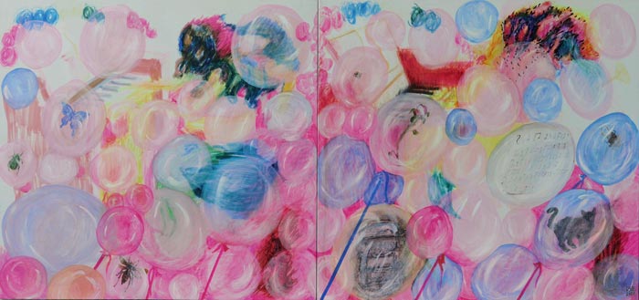 《鋼琴、氣球與昆蟲》70×160m布面馬克筆,丙烯 2023