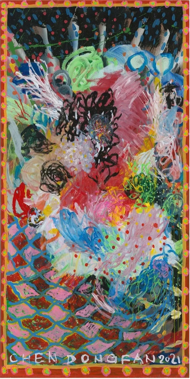 陳棟帆的創(chuàng)作一直關(guān)注力量的傾注與情感的節(jié)奏,其作品重視生命力的燃燒、轉(zhuǎn)化與其間詩意的流淌,探求繪畫之靈。觀者將穿行在一片片木板大幅繪畫的叢林中,意象和情感隨著筆觸與色彩肆意點染,一幀幀繪畫隨著移步換景而紛至沓來。這片繪畫的矩陣是生命不可言說之事的藝術(shù)轉(zhuǎn)化。