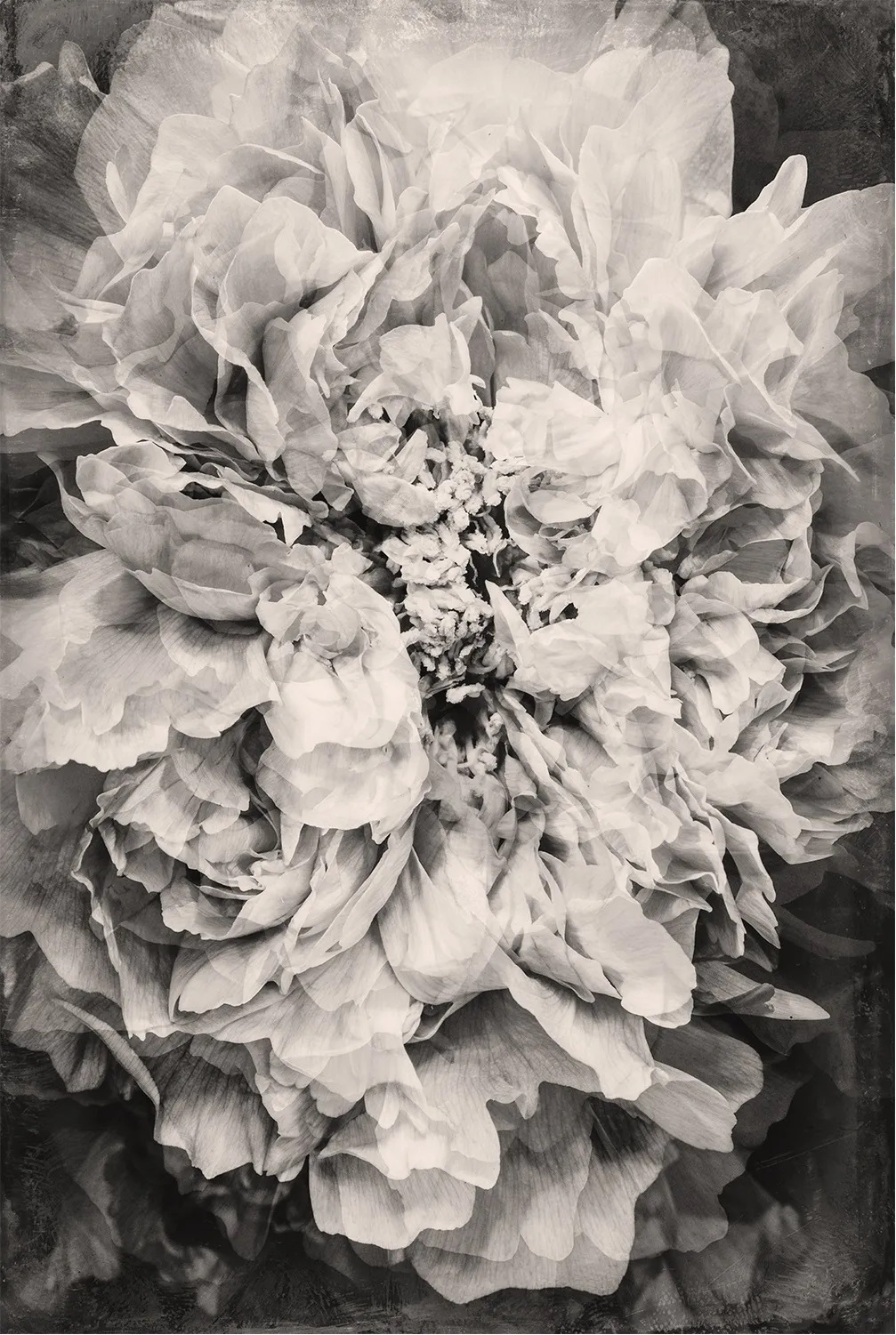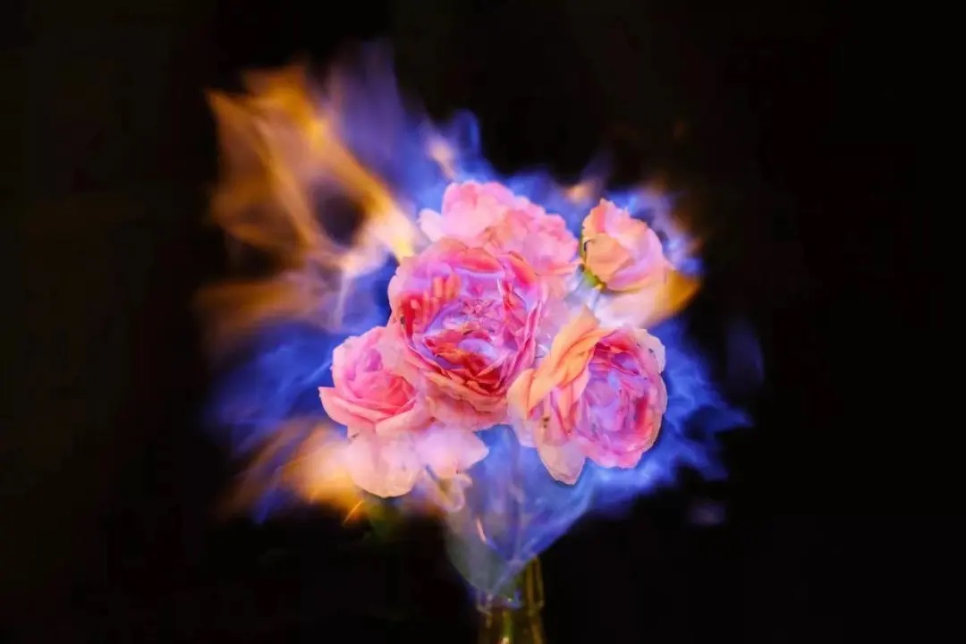 花兒被大火吞噬,火焰捕獲了花朵凋謝前美麗的瞬間。這一系列共有15幅,每一朵花兒都是獨立呈現(xiàn)——一個搭配和諧的花束、一朵盛開的盆花、一個凋謝的花朵。在這張作品中,黑色襯托著粉紫色的牡丹,最簡潔的素材——鮮花和火焰,將渴望、記憶、希望、愛、命運、死亡、全部匯入作品中。