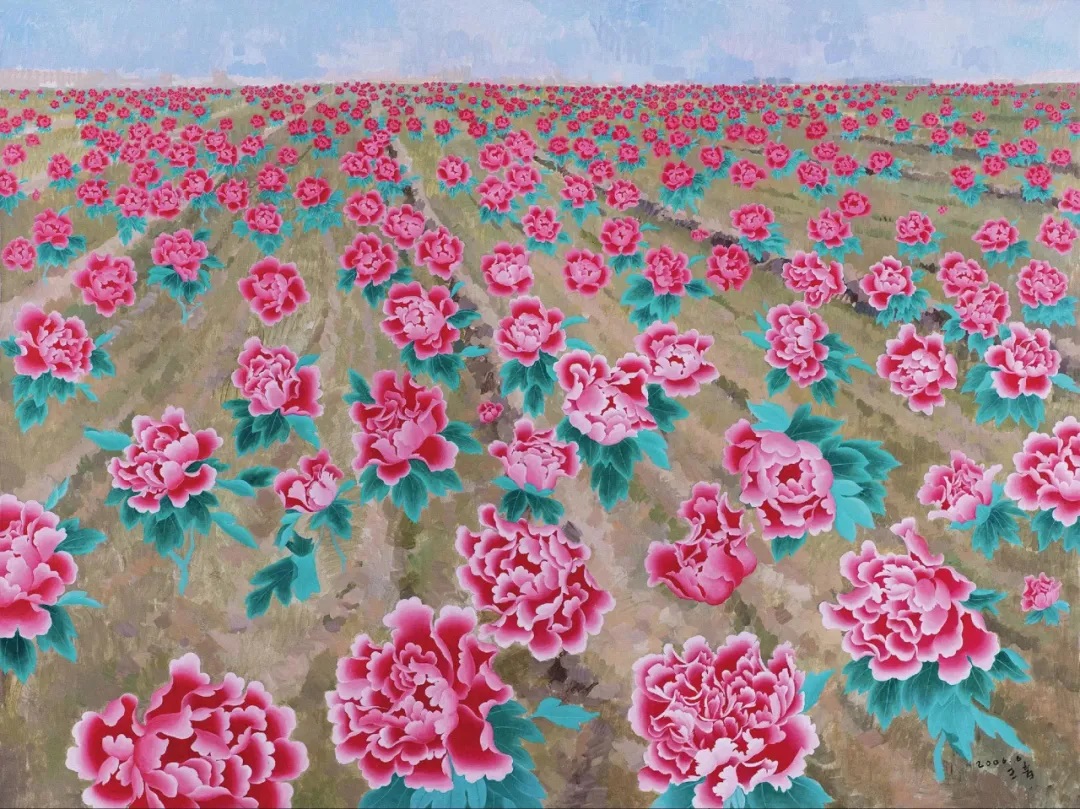王音與民間畫師合作,在自己的創(chuàng)作上,讓畫師們批量復(fù)制艷俗的牡丹形象,有序地布滿整片畫布。大朵的花兒仿佛從泥土中兀自生出,恣意開放至狂歡熱烈,直至開到了土地的盡頭,與天空相連。藝術(shù)家用大筆觸描繪天地,天之輕、地之沉,皆在自信且大膽地寫意筆觸中得以體現(xiàn)得淋漓盡致。然而,那高度細(xì)節(jié)化、猶如工筆般強調(diào)色彩過渡和瓣葉姿態(tài)的牡丹花陣,卻硬生生地與黃土藍(lán)天相生一處,而單點透視下的陣列排布又讓你無法將花兒們從土地中抽離開去。兩種審美、兩種意境、兩種情趣便這樣突兀地、強勢地、不合情理地存在于同一空間,迫使你去觀看,去審視,去接受。正如當(dāng)年遍地可見的牡丹裝飾畫一般,在中國人民樸素的日常中,兀自開放著,打破一切審美的可能,成為一種真正草根的“趣味”,迫使著人們?nèi)チ?xí)慣,去接受。