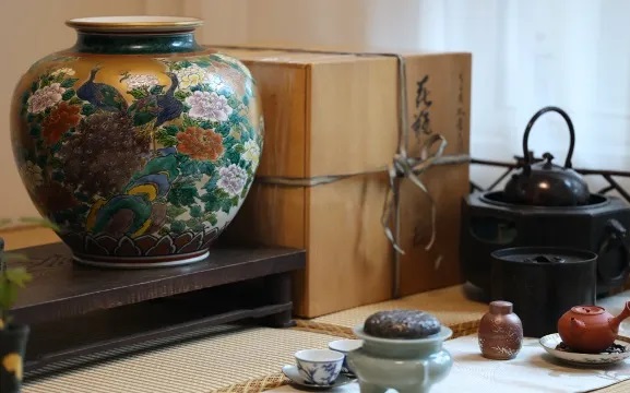 紙本水墨(布面印刷)、方幾、茶壺、詩