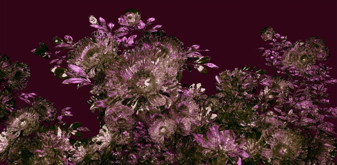 黃可一參考在淘寶網(wǎng)上暢銷的一批牡丹畫進(jìn)行構(gòu)圖,先用3D建模軟件將這些平面的牡丹畫立體化,再將立體牡丹模型渲染成晶瑩剔透的水晶般質(zhì)感,然后通過圖形處理軟件將立體牡丹模型平面化,并通過調(diào)節(jié)光感和色彩使畫面呈現(xiàn)出絢爛斑斕、流光溢彩的效果。為了更好地突出水晶牡丹的璀璨和華麗感,圖中的背景處理成深紫紅色或深藍(lán)色,使整個畫面同時籠罩在典雅幽靜的氛圍之中。