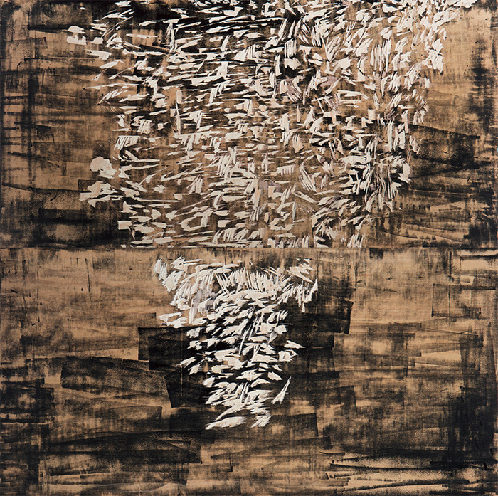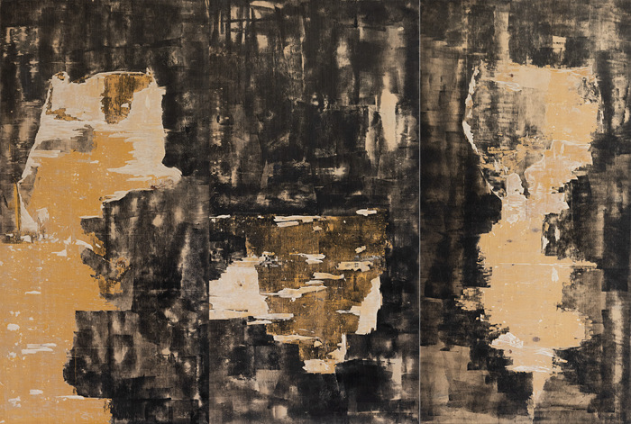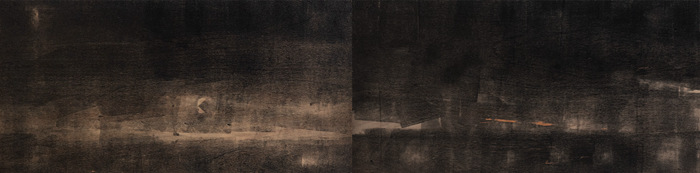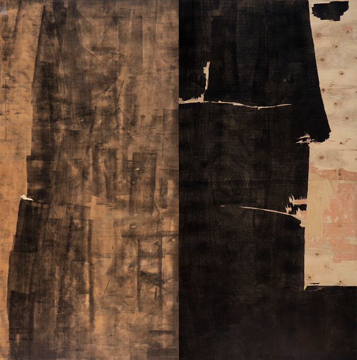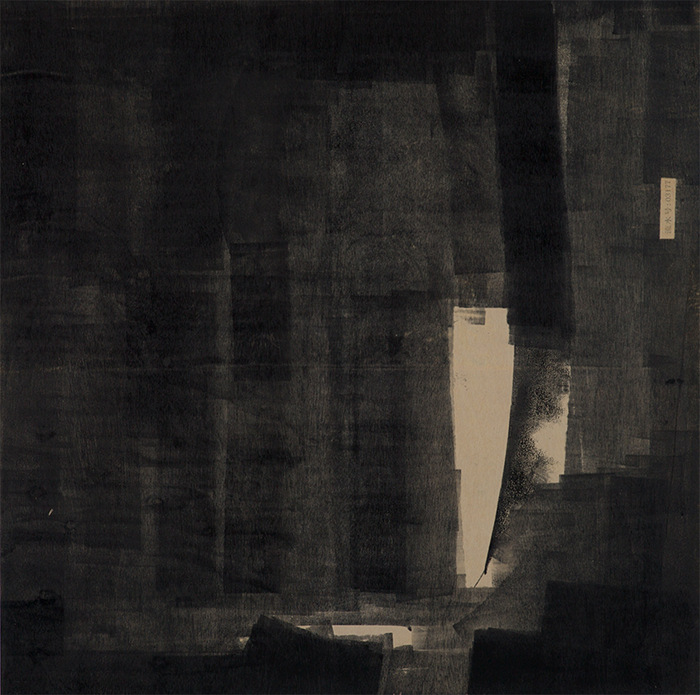 王綺彪改變了油墨和木板的傳統(tǒng)功能,在他這里,油墨成了他的“板象藝術(shù)”唯一使用的“色彩”,他將沾滿油墨的滾軸變成沾滿“色彩”的“畫(huà)筆”,在木質(zhì)板材表面滾動(dòng)。一方面,手臂不同的壓力和滾軸的快慢形成了墨色隨機(jī)的深淺濃淡變化,使油墨在板材上呈現(xiàn)出水墨大寫(xiě)意神韻,卻又極富油畫(huà)般的厚重感和塑造性;另一方面,他通過(guò)油墨滲向木紋肌理產(chǎn)生的板材纖維筋絡(luò)的僨張,以及板材自身豐富錯(cuò)落的天然木色,共同形成酷似中國(guó)古代帛畫(huà)的面貌,產(chǎn)生深沉感和神秘性,距離感和深邃性,營(yíng)造出一種陌生又熟悉的奇異空間。這個(gè)奇異空間里,王綺彪一刀未動(dòng),傳統(tǒng)木刻版畫(huà)的命脈:刀法,在此消失殆盡,繼之而來(lái)的,是王綺彪的“墨·板”世界的誕生。