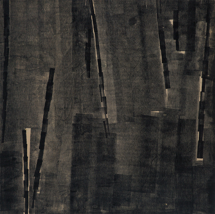 德國(guó)雕塑刀的“錯(cuò)用”,讓我早期的木刻呈現(xiàn)了不一樣的表現(xiàn)形式,后期的創(chuàng)作增添了本是印刷的油墨滾子的使用,在板上的涂抹中,找到刻、板和油墨三者彼此互相融入的世界,而我敏感地意識(shí)到差異的意義,但是這只是開(kāi)端,生活的領(lǐng)悟、大量書(shū)籍的閱讀,讓我看到了本是媒介的木板,同時(shí)是我共同生長(zhǎng)的獨(dú)立個(gè)體,它不再只是展現(xiàn)“我”的媒介,更是它自身存在獨(dú)立性的印證。從“我”到“我和物質(zhì)”再到“物質(zhì)本身”,創(chuàng)作過(guò)程中“我的世界”不再執(zhí)拗于創(chuàng)建一個(gè)不同他人的“我”,而是平等傾聽(tīng),誠(chéng)懇勞作。木板不再是工具,而是目的本身。