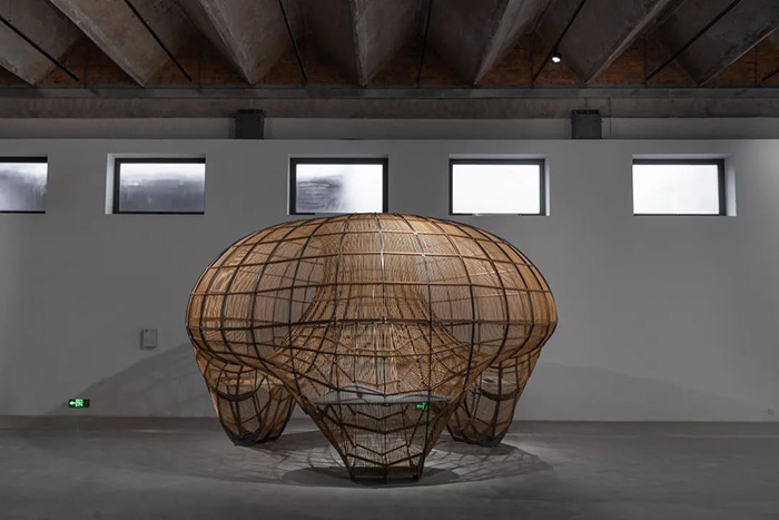 羅宇杰是中央美院建造課題教師,他加入中國(guó)鄉(xiāng)建院,成立并負(fù)責(zé)可續(xù)鄉(xiāng)村工作室。他遵從傳統(tǒng)造籠的材料和方式,融合當(dāng)下工業(yè)技術(shù),建造生成一個(gè)被“放大”到人可以進(jìn)入其下的籠?!盎\”成為一個(gè)“建筑”,其內(nèi)有鳥(niǎo)落腳的“大地”,它的上部起“穹籠”可以對(duì)人的形成裹縛,人步入“籠”下而被包縛,而鳥(niǎo)在這個(gè)相對(duì)闊大的“空間”內(nèi)實(shí)現(xiàn)飛翔。