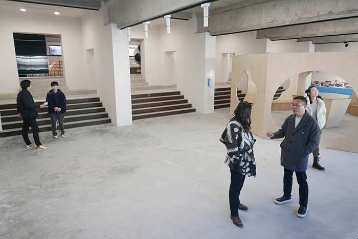 與常見(jiàn)的美術(shù)館不同,金秋野利用兩個(gè)廠房地勢(shì)的差異,構(gòu)建了一個(gè)像“船舷”一樣的平臺(tái),可以俯瞰下面的大型裝置藝術(shù)作品。他說(shuō)“甚至建筑本身也可以是藝術(shù)作品,我們甚至可以在里面蓋一個(gè)房子,從船舷直接走過(guò)去,欄桿是可拆卸的,這樣就成為一個(gè)場(chǎng)館和藝術(shù)品融合到一起的、真正意義上的實(shí)體的沉浸式空間,這是我們?cè)O(shè)計(jì)場(chǎng)館的初衷”,觀眾真正可以做到從各個(gè)角度觀看作品。