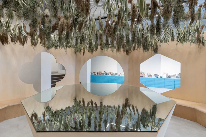 犬吠工作室由塚本由晴和貝島桃代于1992年在東京創(chuàng)立,他們挑戰(zhàn)過(guò)度工業(yè)化的建筑?!痘ú莶杈銟?lè)部》的設(shè)計(jì)是一個(gè)“由花草茶標(biāo)準(zhǔn)的生產(chǎn)過(guò)程衍生出的建筑”。在此休息的人們抬頭便可以摘下一片草葉泡茶喝。俱樂(lè)部的洞口呈花、月、六邊形,引用的是中國(guó)傳統(tǒng)園林里墻上的門(mén)窗,用墻板圍出了一個(gè)花草園。策展人李涵評(píng)價(jià)道:“它是一個(gè)藝術(shù)品,還是一個(gè)屬于建筑空間的功能?我們希望作品有一種混雜的狀態(tài),它既是藝術(shù)品,又是建筑的一部分,又可能是一個(gè)‘房中房’”。