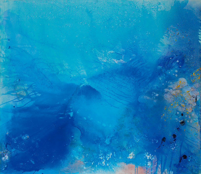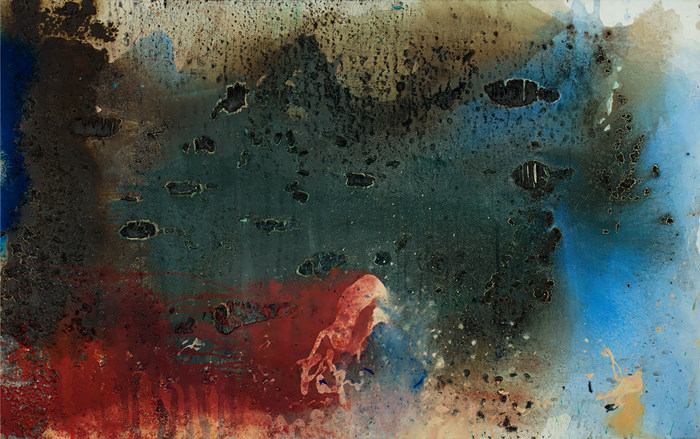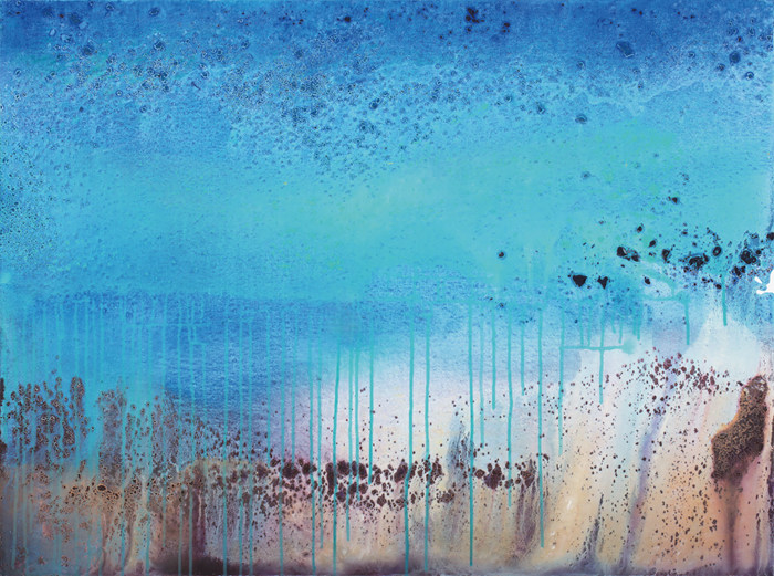 在繪畫技法方面,馬路吸取了中國水墨畫的營養(yǎng),一改油畫筆觸強直堆積的厚涂法,多是利用丙烯與綜合材料,這使得他在畫幅風煙中可以自由揮灑。他用顏料本身在自然物理化學作用下的流淌、堆疊、斑駁、互溶、滲透等變化,再現(xiàn)出一種看似無形無象,卻又仿佛形象紛呈的“宇宙圖景”。