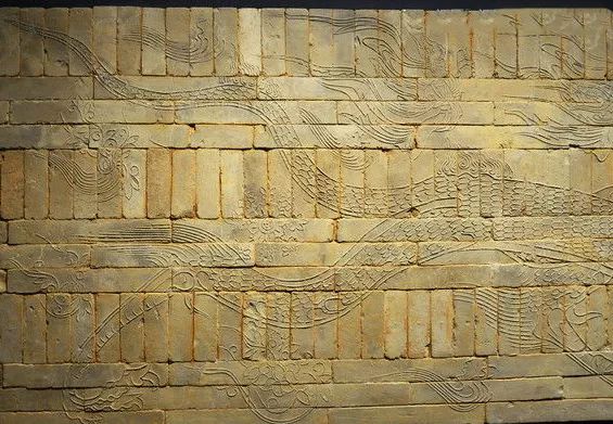 拼嵌磚畫常出現(xiàn)在南朝墓中,“羽人”“戲龍”“戲虎”“飛天”常常是磚畫的元素,龍、虎的瑞獸形象象征著身份與地位,羽人則是墓主人對美好向往的表達(dá)。這組《羽人戲龍拼鑲磚畫》出土于江蘇省丹陽縣胡橋公社寶山大隊(duì)吳家村墓,一條大龍居中,騰云駕霧,張牙舞爪。