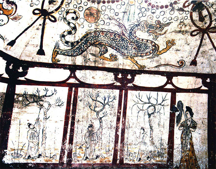 這幅《青龍人物圖》壁畫出土于太原市焦化廠唐代墓葬中,位于墓室東壁。一條騰飛的青龍占據(jù)了畫面的一半,旁有紅日、星象、寶相花、流云。