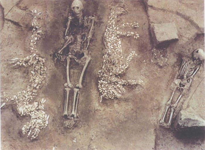 除了東北地區(qū),在中原地區(qū)的史前時期也有令人稱奇的龍形圖案。在河南濮陽西水坡一處距今6400年的史前遺址中,考古工作者在第一組45號墓穴中,發(fā)現(xiàn)了古代先民用蚌殼精心擺塑的龍虎圖案:龍和虎分別位于墓室中部男性骨架的左右兩側(cè)。其中,龍圖案身長1.78米,昂首、弓身、長尾,前爪扒、后爪蹬,猶如飛龍?jiān)谔煲话悖胂罅κ恪?/p>