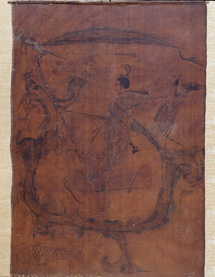 這件《帛畫人物御龍圖》出土于長沙子彈庫楚墓,畫面中心繪一有胡須的楚國貴族男子。他手執(zhí)韁繩,駕馭著一條巨龍正向天國飛升。這幅帛畫反映出先民們對人死后靈魂不滅,乘龍?zhí)煊位虺她埳斓囊环N愿望。龍昂首卷尾,弓身成舟,人物御龍乘風(fēng)白鷺相隨,表現(xiàn)出男子軒昂自若的風(fēng)度。此帛畫是喪葬中使用的“魂幡”。