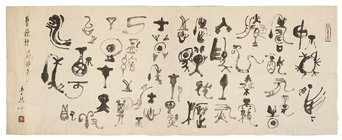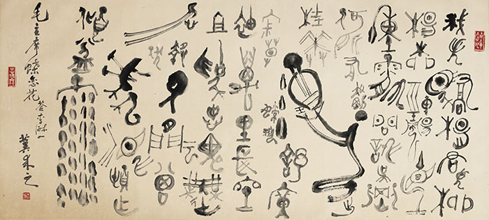 在張郎郎看來,李駱公的篆草書法將中國古代甲骨文和象形文字,包括古代壁畫、巖畫上刻的字演化為一種新的裝飾文字和書法樣式,其中既蘊含著深厚的古代藝術學養(yǎng),又有非常現(xiàn)代的創(chuàng)新意識。“從表面上看,李駱公先生的篆刻書法好像與我父親張仃先生的焦墨山水完全是兩回事,但他們實際表現(xiàn)的都是藝術無止境的探索精神,他們都在自己的道路上探索,能夠走到哪是哪,走著走著發(fā)現(xiàn)柳暗花明又一村,這就是他們一生奮斗過程的寫照?!?/p>