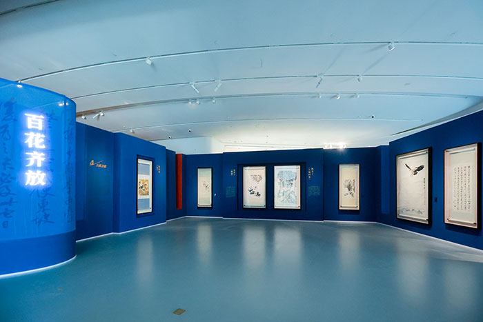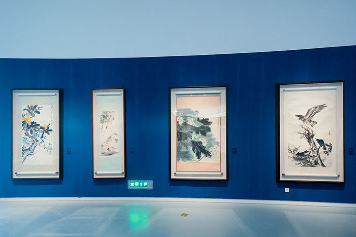 此次展覽以“傳統(tǒng)與變革”“河山如畫”“人民贊歌”“百花齊放”四個單元,展現(xiàn)百年中國美術(shù)史的面貌及成就?!皞鹘y(tǒng)與變革”,是以“時代性”踏中國畫改革出路,著重呈現(xiàn)在二十世紀(jì)中國文化飽受外來文化沖擊的背景下,中國美術(shù)迎來的重要轉(zhuǎn)變與挑戰(zhàn),從而引發(fā)了中國畫的變革與改良之路;“河山如畫”,是以百家畫派“山水畫”呈中國畫百年成就。聚焦二十世紀(jì)山水畫創(chuàng)作的各大流派,尤其是新金陵畫派、嶺南畫派等在新中國美術(shù)史上極具創(chuàng)新和開拓成就的重要畫派,從而感受藝術(shù)作品中中華河山的壯麗之美;