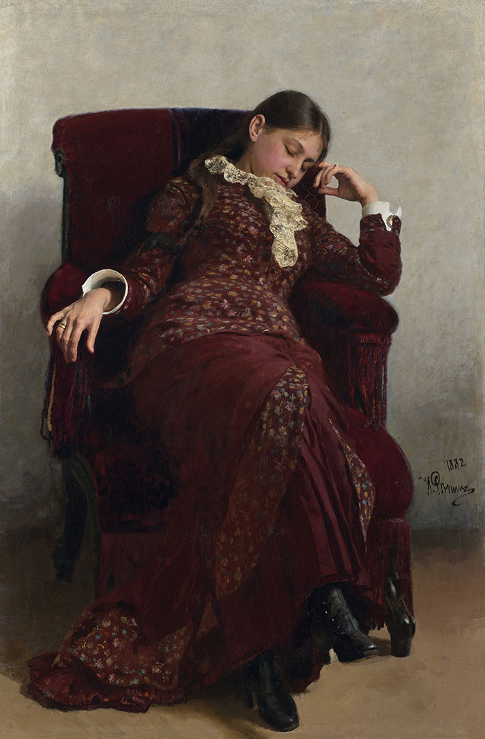 1877年列賓遷居莫斯科,次年加入巡回展覽畫派,以索菲婭公主為主題創(chuàng)作首幅歷史畫。在莫斯科,列賓結(jié)識(shí)了文學(xué)家、音樂(lè)家等友人,并以肖像畫家的敏銳為他們留下珍貴畫像——本次展出的克拉姆斯科依與特列季亞科夫的肖像即為其中代表。以妻子維拉為模特的《歇息》,則展現(xiàn)了畫家捕捉瞬間的功力與脈脈溫情。