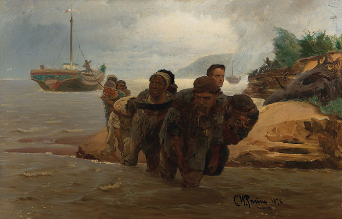1868年,還在圣彼得堡皇家美術(shù)學(xué)院讀書的列賓在涅瓦河上第一次見(jiàn)到纖夫,萌生了創(chuàng)作這一主題的想法。五年后,他完成了享譽(yù)世界的《伏爾加河上的纖夫》。展覽開(kāi)篇以與列賓同游伏爾加河的胞弟瓦西里·列賓的肖像為開(kāi)篇,展出列賓在旅行期間完成的纖夫速寫、素描和草圖,展現(xiàn)了列賓極高的色彩修養(yǎng)和對(duì)表現(xiàn)對(duì)象形體十分扎實(shí)而有力的塑造。