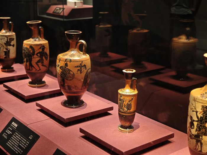 尤其是通過古希臘紅繪與黑繪陶瓶的接連展陳,呈現(xiàn)古希臘神話里的故事,觀眾在觀看展品的時候,欣賞陶瓶上的圖案,再配合展簽文字和講解,就仿佛閱讀了古希臘神話一般。這種沉浸式的視覺熏陶會比單純的文字閱讀更使人帶入故事中去。而單獨一個荷馬的頭像擺在展廳中心的醒目位置,觀眾在他身邊穿行,仿佛是與《荷馬史詩》不經(jīng)意的相遇,也昭示著荷馬的睿智與深邃的思想影響著后世,不管膚色如何,人們共享一幅藝術(shù)與文明的史詩級畫卷。