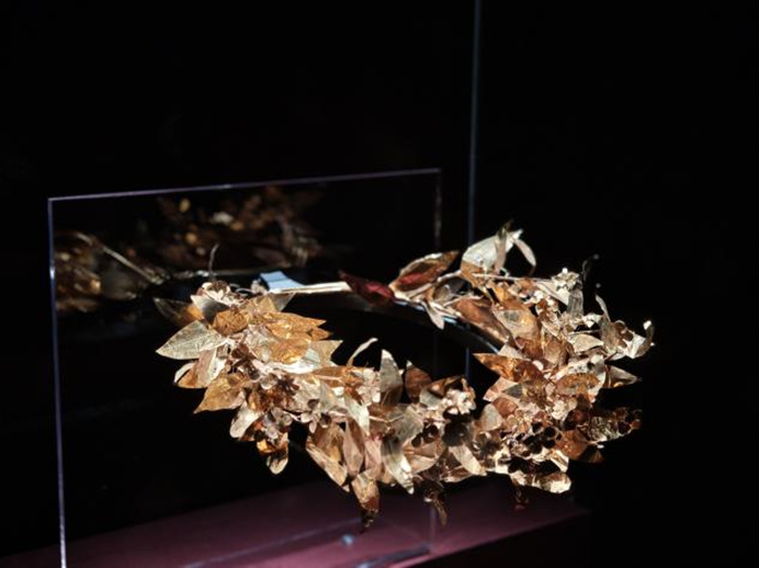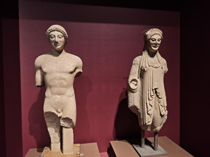 不少重量級代表性展品亮相本次展覽,比如之前提到的荷馬的頭像。還有就是亞歷山大大帝的頭像、阿伽門農(nóng)黃金面具、希臘化時代的黃金花冠,以及古希臘悲喜戲劇的面具石雕,以及被稱為面部具有“古風(fēng)式微笑”的男女形象雕塑——庫洛斯(男)、科萊(女)。這些展品在古希臘文化中占據(jù)重要的地位,是觀眾可以重點了解的。當(dāng)這些展品被重點陳列時,展覽的輕重緩急便更加分明,有層次感。