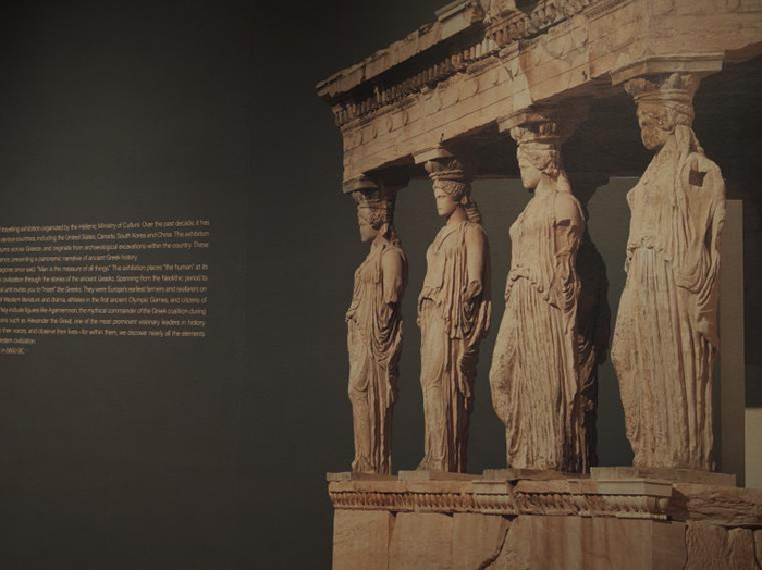 本展覽結(jié)合場景復(fù)原、建筑工程圖、雕塑、器物、文案等,充分展示古希臘文明。觀眾穿梭在展廳里,走過繪有帕特農(nóng)神廟的女像柱的展墻,瀏覽一個個展柜,閱讀一面面文字,如同進(jìn)入了醉人的古希臘世界,仿佛聽到了那遠(yuǎn)古異邦傳來的聲音,與文明對話。