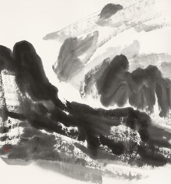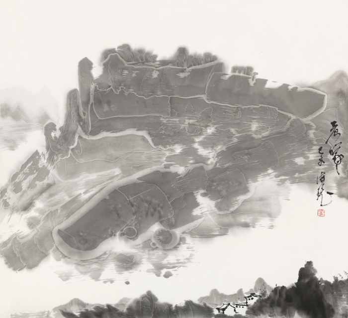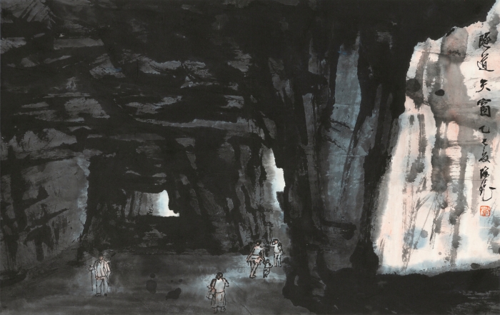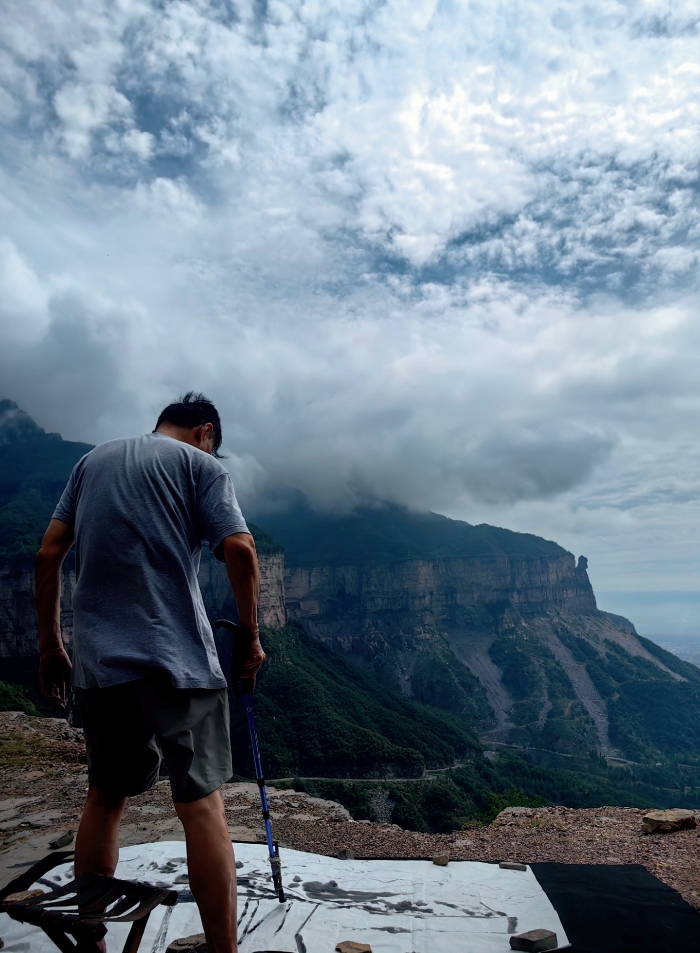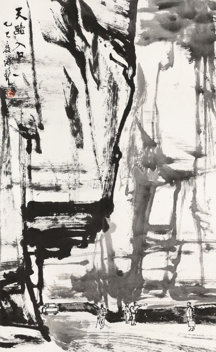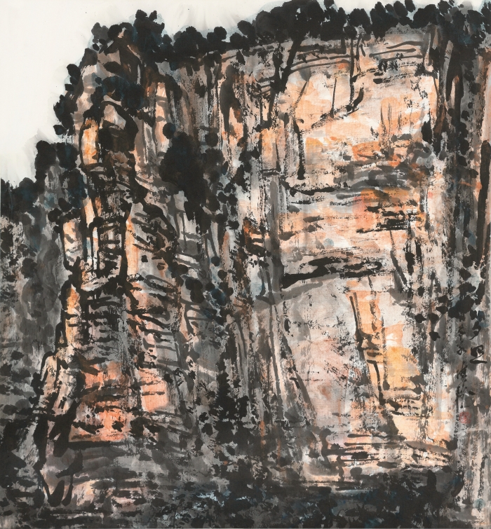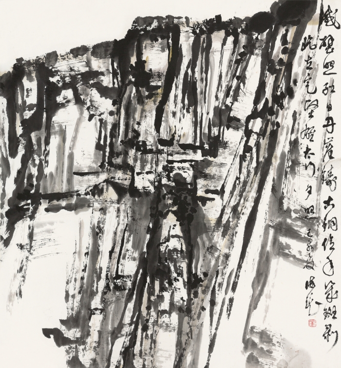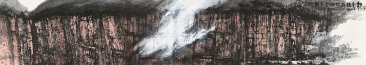 他用腳步丈量當(dāng)年戰(zhàn)士們攀爬的險(xiǎn)陡山徑,用目光捕捉巖石上未褪的烽火印記,將身心完全融入這片承載民族記憶的土地?!疤械拿恳坏礼薨櫪?,都藏著民族的骨頭。”他以竹竿為長(zhǎng)毫,以濃墨作山石,筆下峭壁如刀劈斧鑿,彰顯著自然的雄奇?zhèn)チ?。在宣紙的焦墨皴擦間,仿佛能看見硝煙中挺立的不屈身影和信念之光。