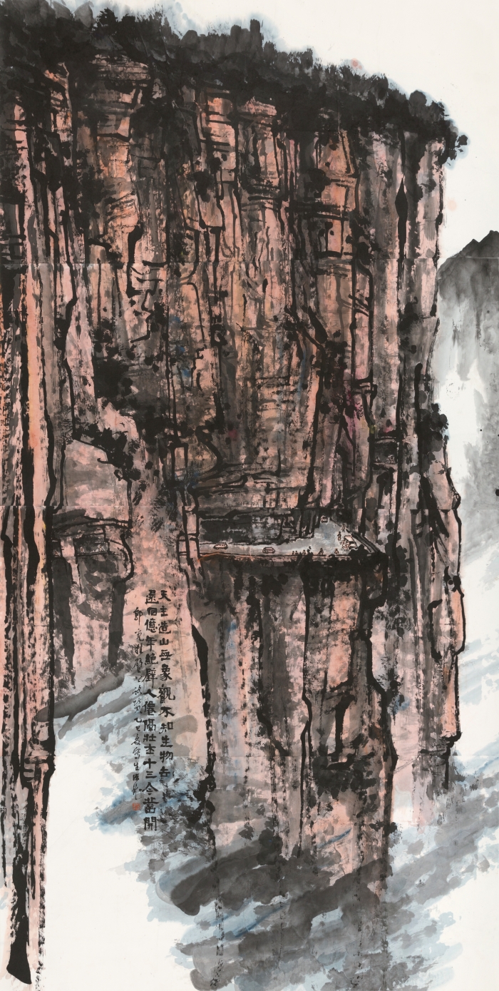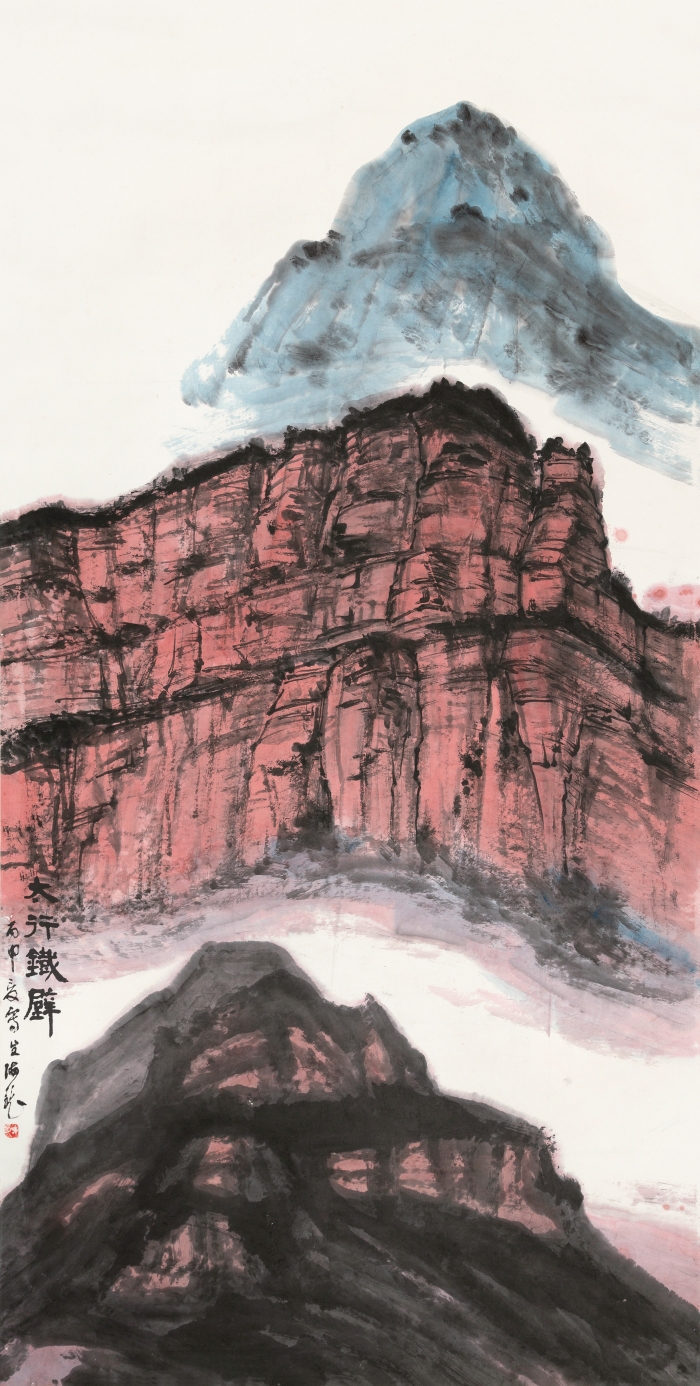 華海鏡運(yùn)用焦墨皴法在山石間游走,以干筆與濕墨交替暈染出的層次感,展現(xiàn)著傳統(tǒng)山水技法與時(shí)代精神的巧妙融合;其書法作品骨力洞達(dá),筆鋒如劍戟挺勁,將“力透紙背”的力道與“氣貫長(zhǎng)虹”的豪情演繹得淋漓盡致。《郭亮掛壁公路全景圖》中,劈面千仞鐵壁壓頂,濃墨如斧鑿巖骨,硃砂似血沁巖縫;《太行氣撼》里,孤峰如天神巨掌破框而出,指縫云濤奔涌,題詩“何人修得如來掌”叩問蒼穹,“萬壑千峰收畫中”盡顯吞吐氣魄。