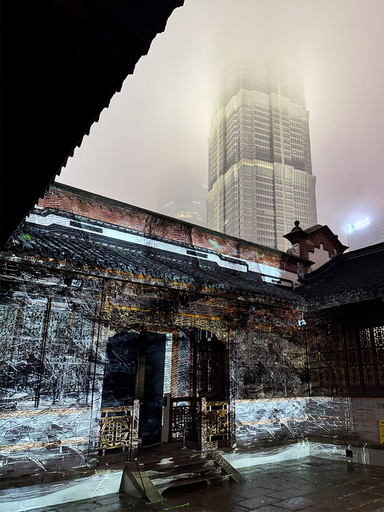 作品刻意保留筆墨的“未完成感”:投影中扭曲的飛白、驟徐的漲墨,恰似缶翁落筆前的沉吟;錯(cuò)位的筆鋒與建筑裂紋重疊,暗合這座被時(shí)代反復(fù)涂抹的屋宇命運(yùn)。而技術(shù)僅充當(dāng)“數(shù)字筆觸”,將建筑表皮轉(zhuǎn)化為動態(tài)宣紙。陸家嘴的霓虹倒影與老宅窗欞交織,形成三重時(shí)空褶皺——吳昌碩的筆意、陳桂春的時(shí)代與當(dāng)代金融城的倒影在此平行對話。